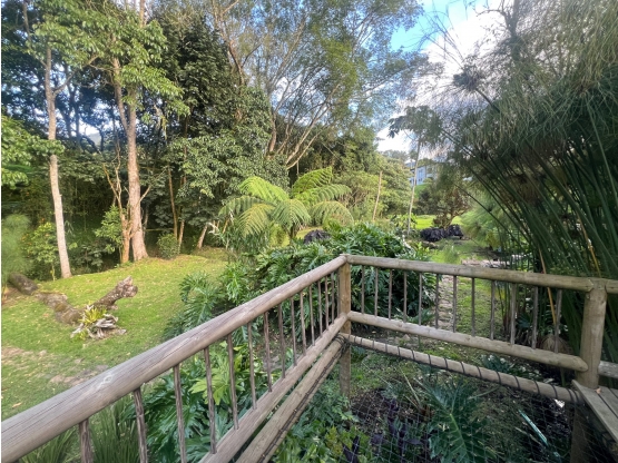 Lago pequeño tijpo zona zen, zona de bbq, mucho verde, arboles, jardín, y en la parte del parqueadero, una cabañita tipo cuarto útil, espacio para unos 5 carros aproximadamente.